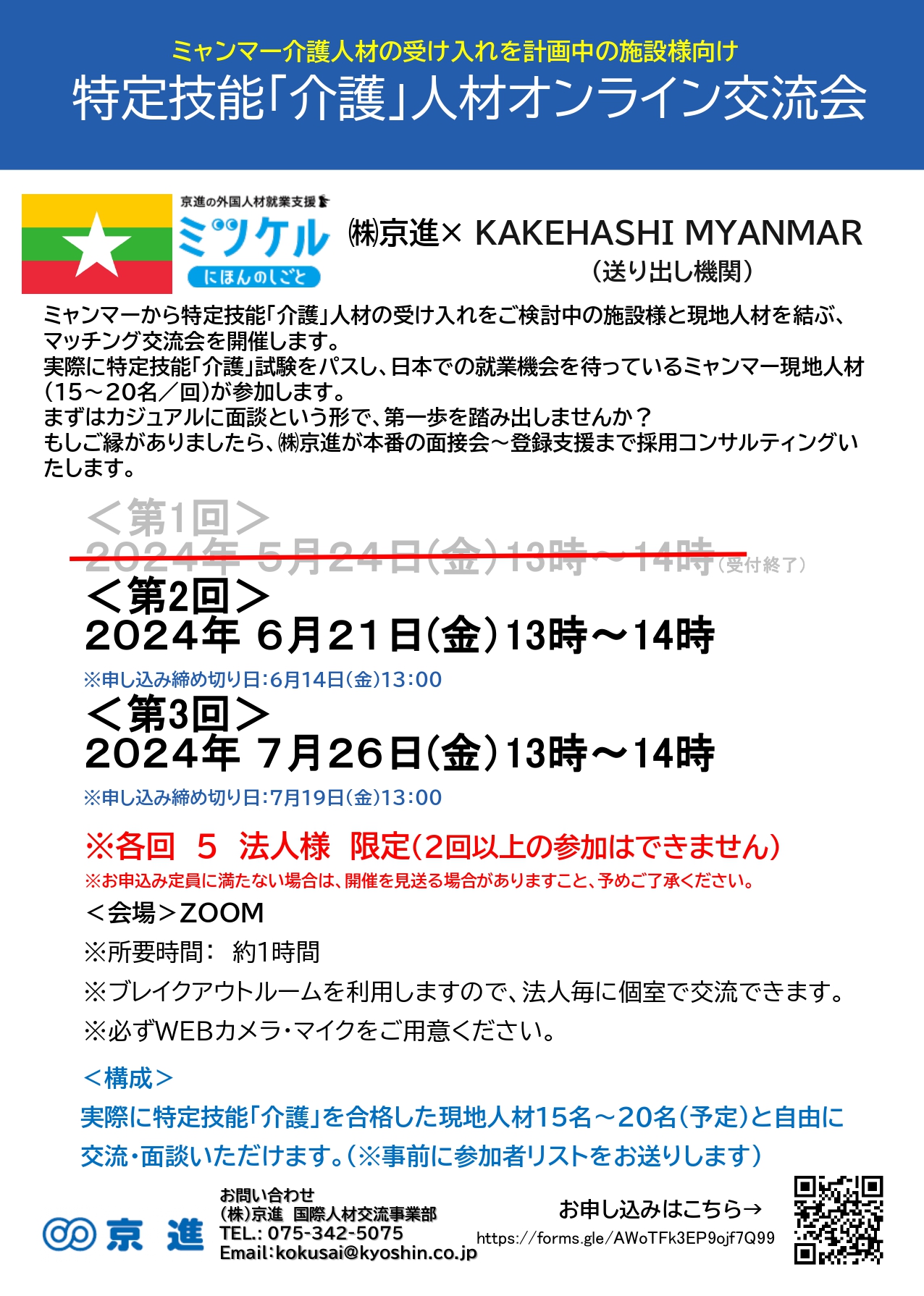 【主催:㈱京進×送り出し機関】ミャンマー特定技能「介護」人材面談会(オンライン交流会)のご案内202405