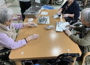 光明苑、焼き芋大会! 投稿日:2025/11/28 施設紹介 東灘区の特別養護老人ホーム、光明苑です。 毎年寒くなってくるこの時期に、玄関の軒先で焼き芋大会が始まります。 今年はあいにくの大雨でしたが、楽しみに待ってくださっている皆様のご期待に応えるべく、 大きなテントを設置して開催いたしました。 お芋を濡れた新聞紙に包んでアルミホイルで包む工程はたくさんの入居者様が手伝って下さリ、 皆様、笑顔で一生懸命取り組んでおられました。 甘い焼き芋を頬張りながら、とても和やかな雰囲気の一日となりました。 この記事をSNSでシェアする Back