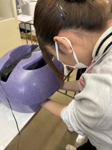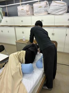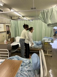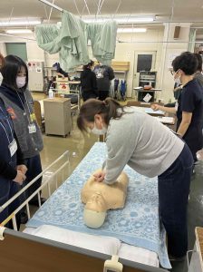 午前中は➀感染予防と衛生学的手洗い、転倒・転落の予防と対応、心配蘇生とAED、誤嚥の予防と対応、全身状態の観察とバイタルサイン測定