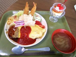 【職員向けスペシャルランチ】です。月に1回程、管理栄養士と給食委託会社が連携しメニューを考えます。通常の給食料金で一回りも二回りもグレードアップしたお昼ご飯を食べることが出来ます。普段は給食を頼んでいない職員もこぞって注文しリフレッシュルームは大賑わい、大人気のイベントです。