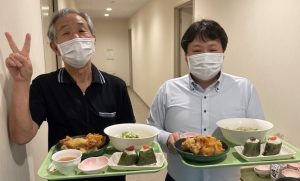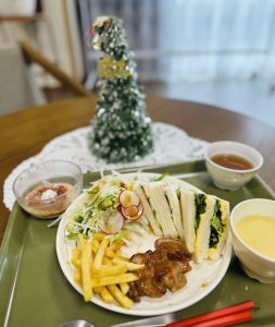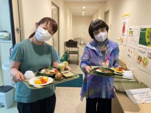 【職員向けスペシャルランチ】です。月に1回程、管理栄養士と給食委託会社が連携しメニューを考えます。通常の給食料金で一回りも二回りもグレードアップしたお昼ご飯を食べることが出来ます。普段は給食を頼んでいない職員もこぞって注文しリフレッシュルームは大賑わい、大人気のイベントです。