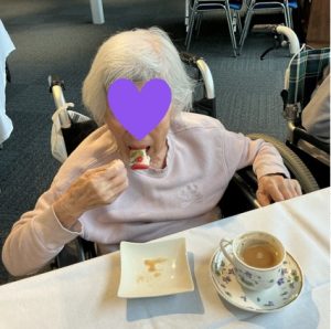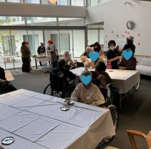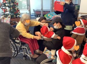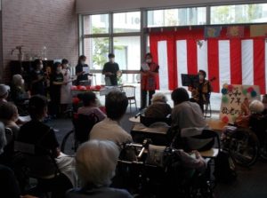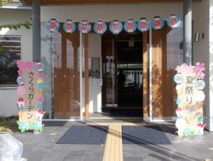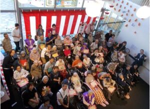 さくらガーデンでは、入居者の皆さんに四季を感じていただくために、年に5回、全体行事を実施します。春はさくらまつり、ご家族の皆さんにも地域の皆さんにもお越しいただき、自慢の桜と春の空気とご家族との時間を楽しんでいただきます。夏は夏祭り、夕方の開催で入居者の皆様にはくじ引きやゲーム、フランクフルトや綿菓子など屋台を回っていただいたり、花火をしたりして、ご家族と一緒に夕涼みをしていただきます。秋は敬老会、職員の三線やリコーダーの演奏でお祝いを盛り上げます。冬はクリスマス会に初釜、クリスマス会は毎年理事長がサンタに扮して皆さんにプレゼントを届けたり、グループ内の保育園からもかわいいサンタたちが来てくれます。新年には、初釜喫茶、入居者の皆さんには地域交流スペースにお越しいただき、お茶を嗜んでいる職員が抹茶を立てて、かわいい練り切りと一緒に召し上がっていただき、ちょっとした喫茶店気分を味わっていただきます。