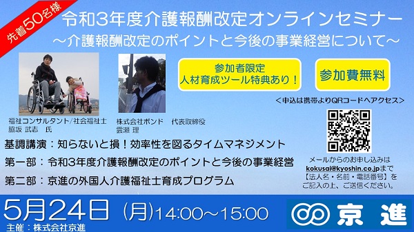 外国人介護士の教育や育成事業を展開する株式会社京進は、5 月 24 日(月)に「介護報酬改定オンラインセミ ナー」を開催します!