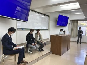 第二部では、『先輩職員とディスカッション』を開催し、第一高校OBの重光さん(モーツアルト兵庫駅前)、原田さん、宝田さん(神戸海岸特養ケアセンター)
